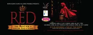 Born Again and Living Parables Drama Ministry presents RED The Hunt for a Killer and The King Thursday, April 27th – Sunday, April 30th. This play is sure to unfold every question in the human heart about what true love really is and just how far it will go! Playwright, Bishop Horace Hockett describes RED by saying, “This production is an incrediblly fun and enlightening childhood story with a suspenseful comedic new twist!