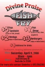 Divine Praise of Nashville Fish FryApril 9, 201610:00am – 4:00pm2420 Brittany Drive, Nashville, TN 37208Please come and support Nashville’s Gospel group Divine Praise of Nashville for thei...