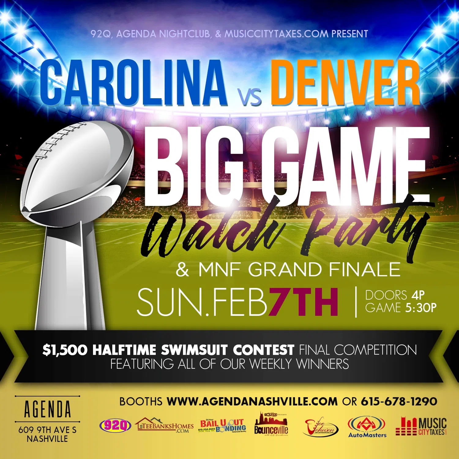92Q invites you to watch the BIG GAME with us! Sunday February 7th at Agenda (609 9th Avenue South) – Carolina versus Denver – for the National Championship! Doors open at 4pm –...