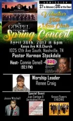 Come and join the Volunteer State Mass Choir tonight for their spring concert. Special guests include:Renee CraigJesse MitchellJuan Santiago & Uninhabited PraiseApril 30, 20176:00pmKanye Ave M.B. ...