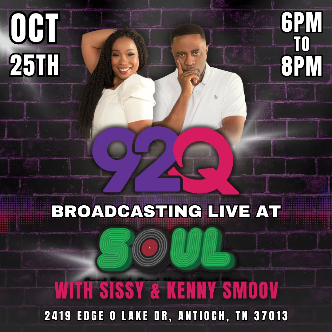 Join Kenny Smoov and Sissy Brown for a 92Q LIVE Broadcast at SOUL Lounge Antioch on Saturday, October 25th from 6pm-8pm!