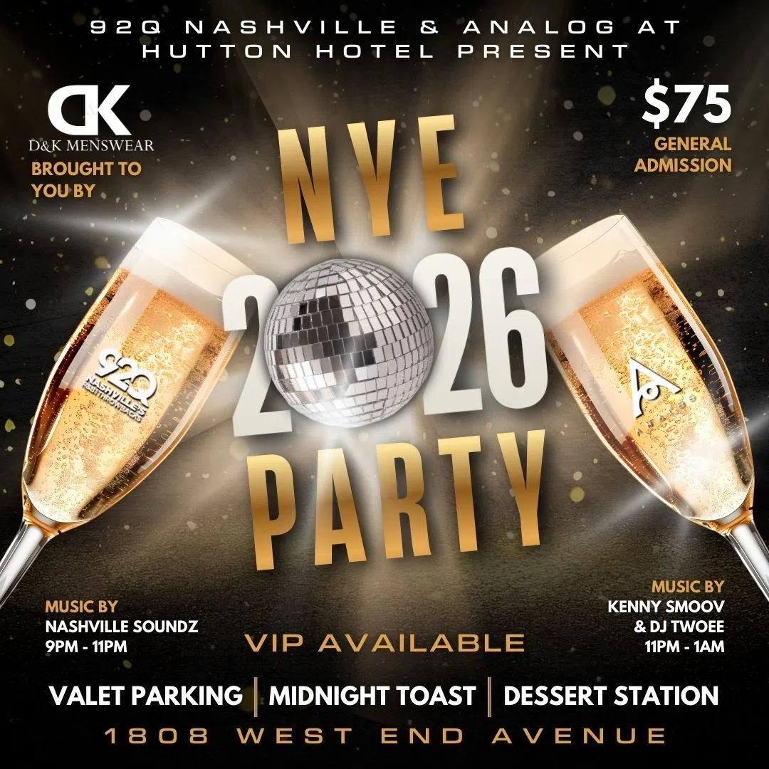 Don’t miss your opportunity to party into the New Year with 92Q and Analog inside the Hutton Hotel with a performance by Nashville Soundz and DJ sets from Kenny Smoov and DJ TwoEE!